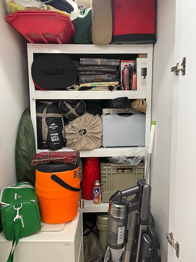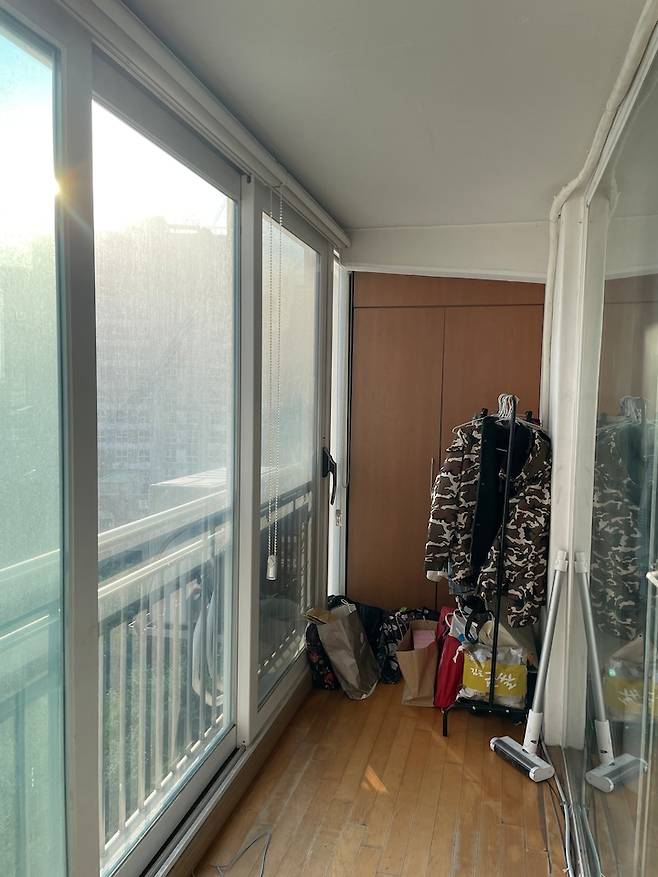 모두 다 벽처럼 보이지만 왼쪽 공간은 캠핑 장비와 계절놀이 용품, 청소용품 등을 보관하고 있는 팬트리입니다! 아래 베란다 사진에서 보시면 비내력벽 철거 후 천장의 가보가 있는 공간까지 앞으로 목공 작업을 실시하여 벽으로 만들었습니다.