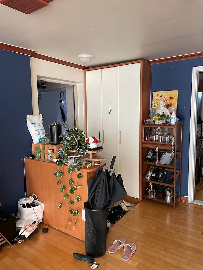 주방 옆에 있는 좀 더 큰 방입니다. 이 방은 현재 붙박이장만 넣어두고 남편의 옷과 이불, 그리고 잡동사니를 수납해두었습니다.