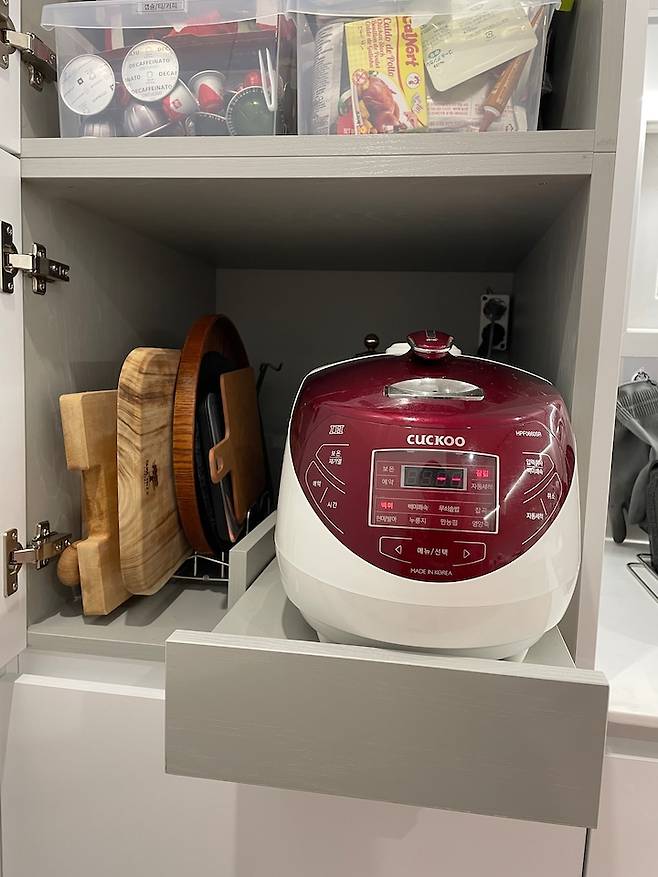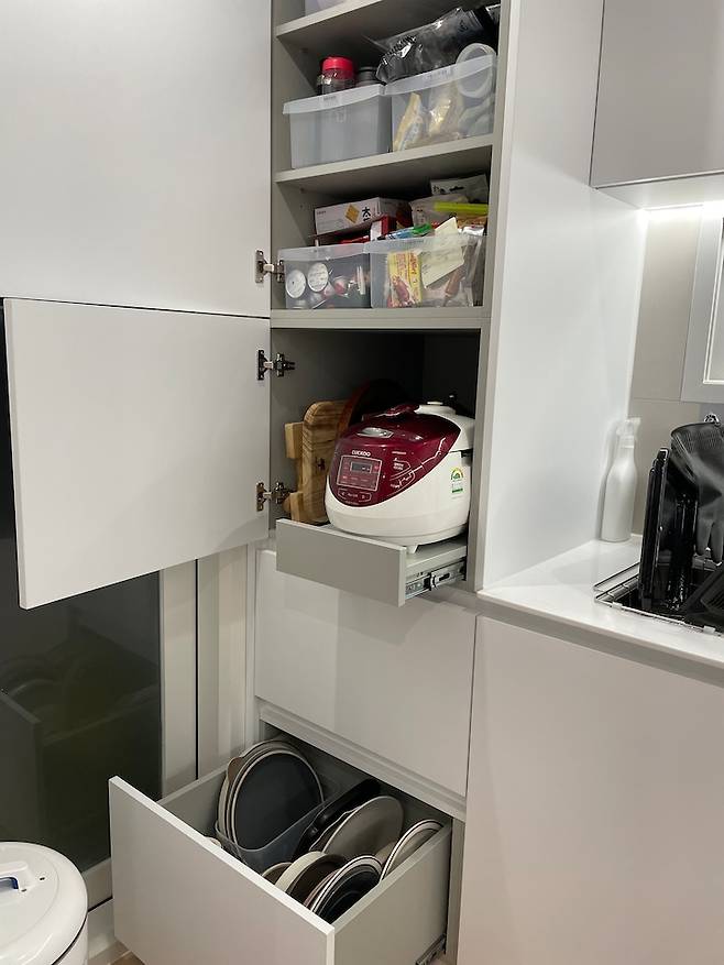 늘 도마 보관이 애매했었는데, 밥솥을 위한 인출식 레일을 설치하고 남는 공간에는 도마를 넣을 수 있도록 칸을 만들어 달라 요청했습니다!