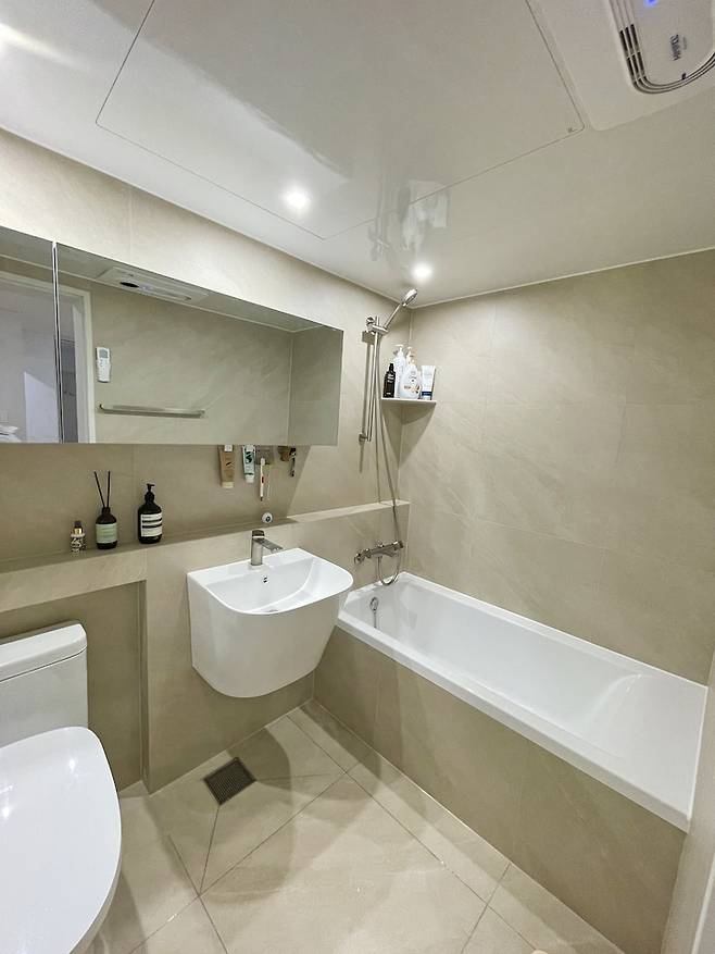 아늑한 느낌을 주기 위해 베이지톤의 포세린 타일 600*600을 사용하여 더욱 넓어보이도록 하였습니다. 수전은 폰타나 무광니켈 수전을 설치했답니다!