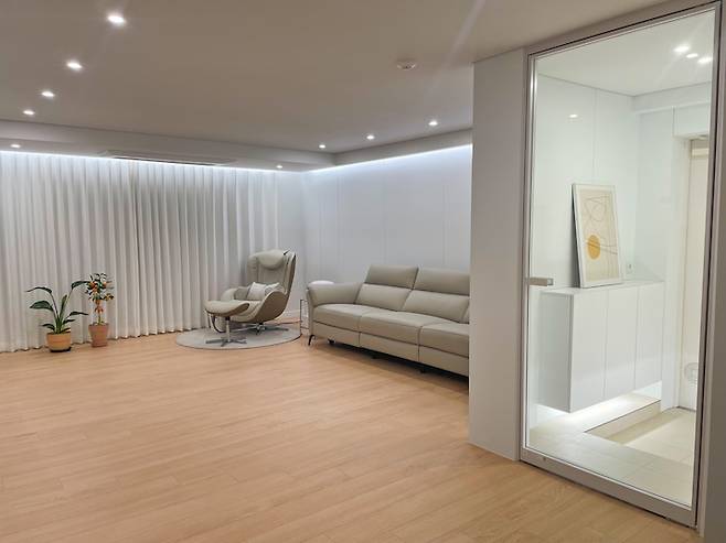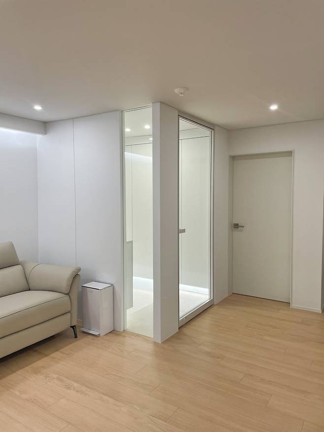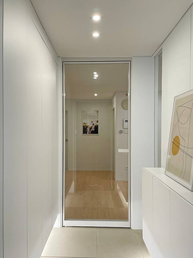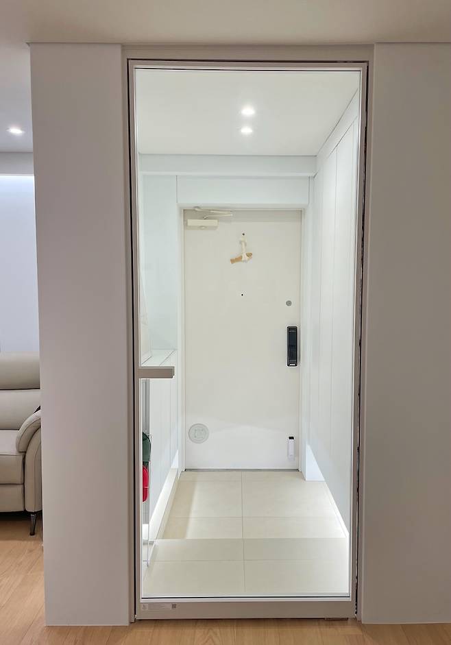 현관을 입구방의 문 앞까지 연장하여 가벽을 설치한 후 중문을 달았더니, 현관이 조금 더 길고 넓어 보입니다. 양방향 중문을 선택하여 사용 시 더욱 편리하게 사용하고 있답니다.