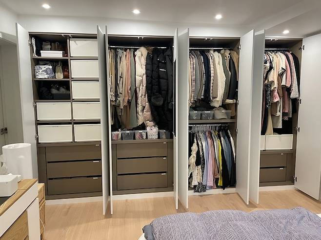 안방 붙박이장은 제가 다 사용하고 있습니다. 붙박이장을 짤 때 어떻게 구성할까 정말 많이 고민했습니다. 이전 집에서 쓰던 수납함/서랍장들을 다 없애고 붙박이로만 수납을 하고 싶었거든요.