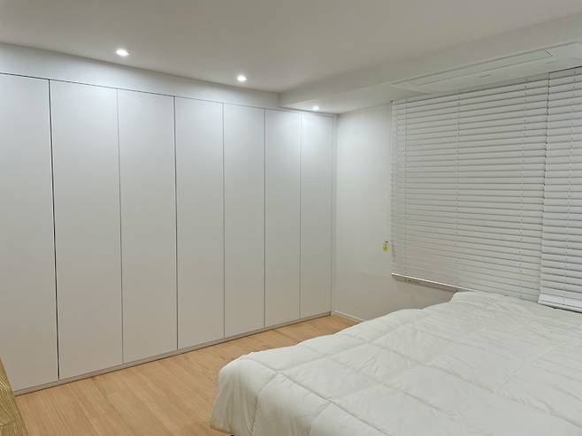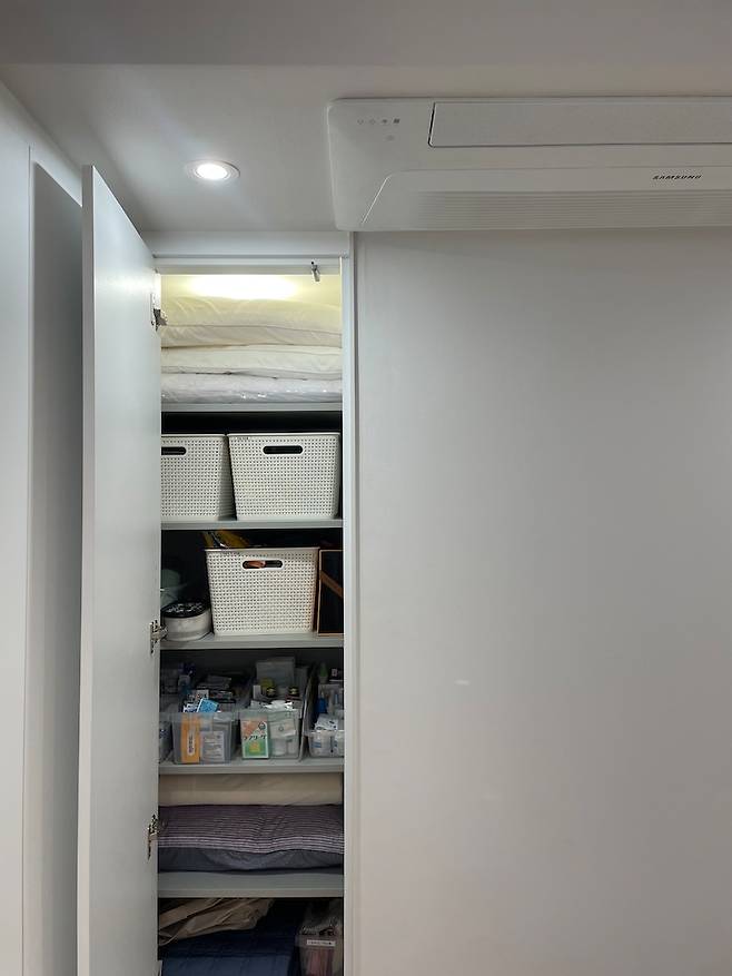 단열재에 신경을 쓴다고 썼지만, 그래도 이 방이 저희 집에서 제일 온도가 낮은 공간입니다. 우수관은 붙박이장 시공 시 가려버렸고, 가려진 공간만큼 붙박이장이 내부가 좁아지기 때문에 그 곳은 칸칸이 만들어서 니트를 수납하고 있어요!