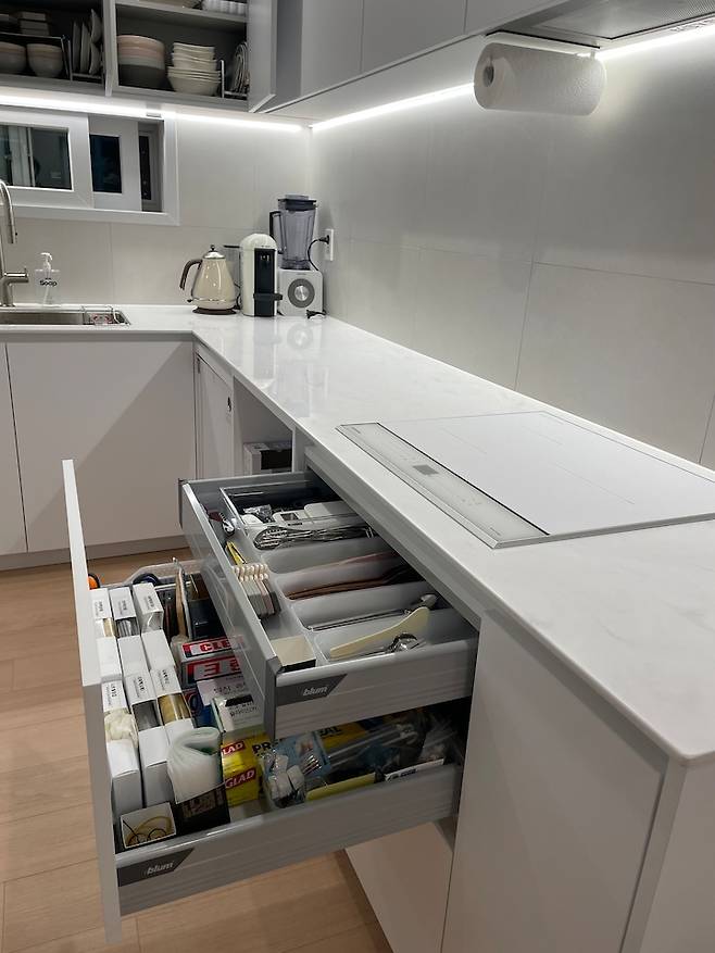 주방에 많은 것을 내놓지 않겠노라! 마음을 먹고 수저와 각종 집기를 인덕션 아래에 둘 수 있도록 속통을 한칸 더 만들어 달라 요청했습니다.