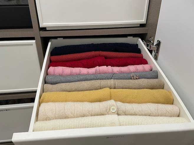 하단에 서랍장을 넣어 속옷, 얇은 티셔츠, 운동복, 바지 등을 수납하고 칸을 많이 만들어 핸드백과 니트류를 정리했습니다.