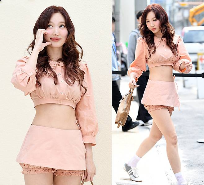 나연은 복고 감성의 핑크빛 셋업을 완벽 소화하며 소녀미와 성숙미를 동시에 발산했습니다.