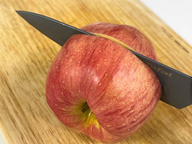 사과를 눕혀 자르면 바닥에 안정적으로 닿는 면이 넓어져 칼질이 훨씬 수월합니다. 또한 눕혀서 자르면 초보자도 얼마든 사과를 쉽게 손질할 수 있는데요.