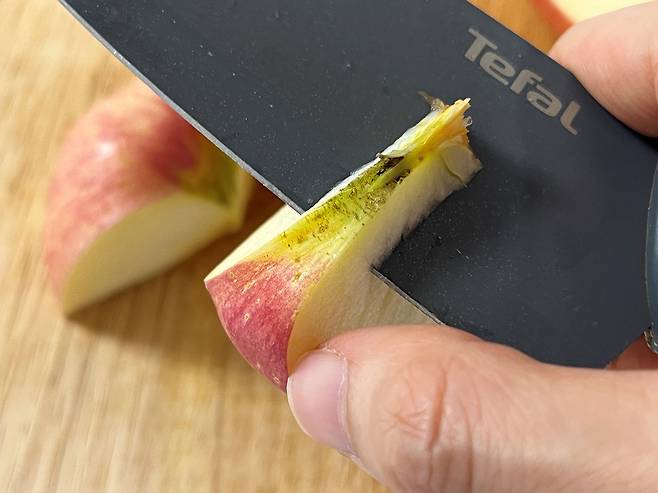 조각낸 사과에 꼭지 부분 붙은 것만 제거해 주면 사과 손질이 끝납니다. 씨를 파내고, 꼭지 부분만 살짝 제거하세요!