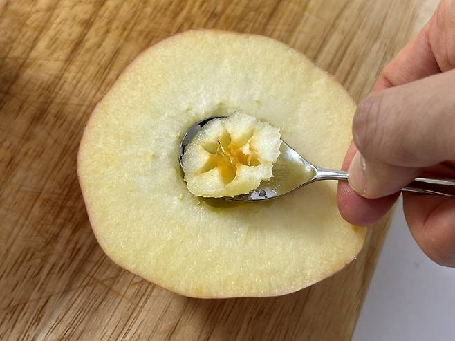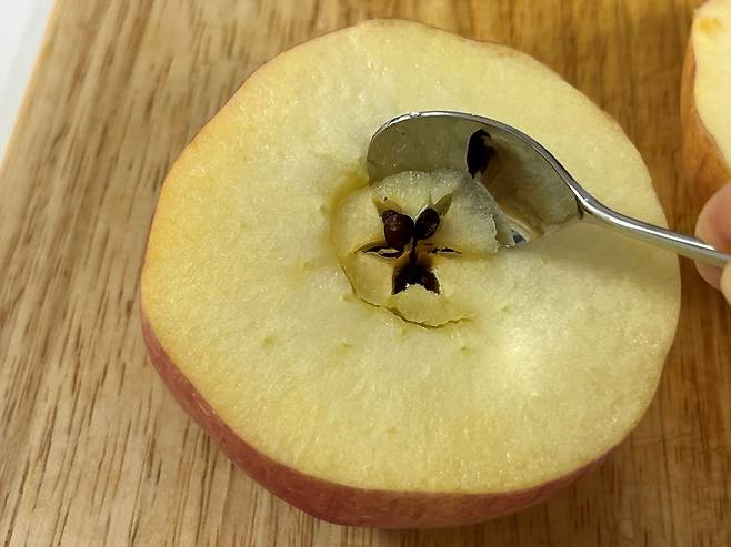 사과를 눕혀서 자르면 가운데 부분에만 씨가 모여서 있게 됩니다. 이 부분의 씨만 제거하면 돼요.