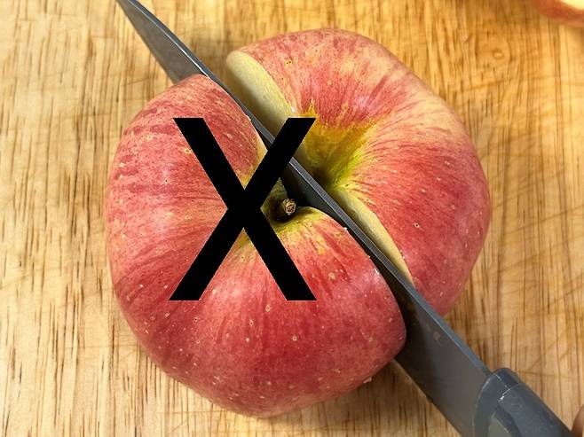 사과는 더 이상 세워서 자르지 마세요. 손을 다칠 위험도 있을 뿐 아니라, 손질하기에도 오히려 더 어렵습니다.