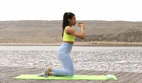 매트에 무릎을 꿇고 앉은 자세에서 시작합니다. 오른발을 앞으로 당겨 바닥에 디딘 뒤, 왼발도 앞으로 당겨 바닥을 짚고 양발을 평평하게 세웁니다. 이 상태에서 스쿼트 자세로 전환하여 엉덩이를 낮춥니다. 다시 왼발을 먼저 뒤로 보내 무릎을 꿇고, 오른발도 뒤로 보내 원래의 무릎 꿇은 자세로 돌아갑니다.