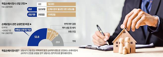 이 때문에 손해사정 업무는 보험사가 위탁한 곳에서 진행하는 경우가 많았다. 보험사에만 유리한 결과가 나온다는 지적이 제기된 배경이다. 금융감독원에 보험금 지급과 관련한 민원이 급증한 데도 이런 점이 영향을 미쳤다. 지난해 전체 보험 관련 민원 중 ‘보험금 산정 및 지급’ 유형의 비중이 절반(53.8%)을 웃돌았다.