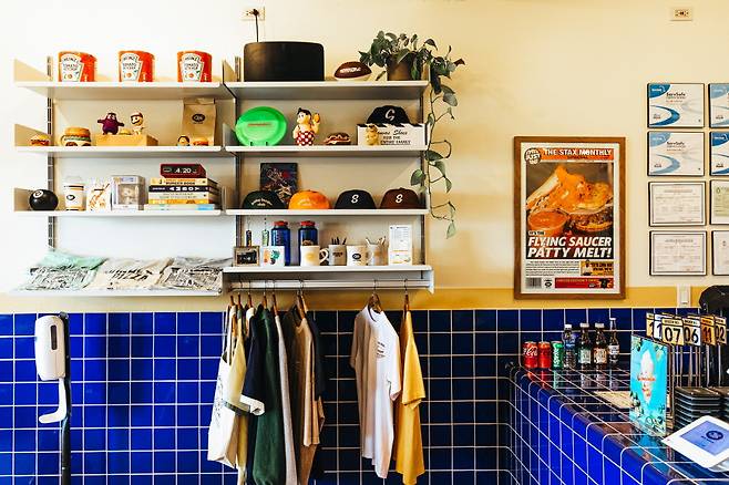 분석 들어간다. 우선 패티. 고동색으로 바싹 마이야르 반응이 올라온, 구웠다기보단 튀겼다는 표현이 어울릴 정도의 굽기. 패티의 장수는 고를 수 있는데 아무래도 다다익선, 더블 정도는 먹어 줘야 한다. 그 위에 체다치즈 그리고 양파. 보통 양파는 링 모양으로 썰어 넣는데 여기는 다져 넣어서 양파의 알싸한 수분감을 버거 전체적으로 균일하게 누릴 수 있다. 그 위에 토마토 2장 그리고 상추 1장. 이 모든 것을 포용하는 소스와 부드러운 번. 순수의 결정체. 감자튀김은 프렌치프라이와 테이터 탓즈(Tater Tots, 원통 모양으로 빚은 감자튀김)가 있다. 모자, 에코백, 티셔츠 등 스택스 스매시 버거 로고를 이용한 굿즈도 판매한다.