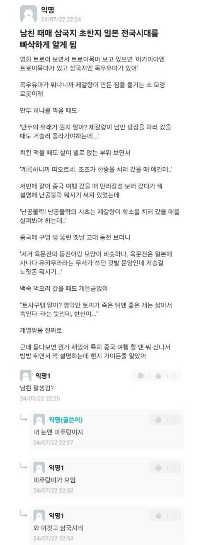 주랑 : 주유주랑이라는 별명 앞에 아름다울 미(美)가 붙어 주유의 별명이 미주랑으로 변경 됐고사서 상에서 묘사되는 주유는 신체가 장건하고 기백이 있는 잘생긴 외모로 묘사되고 있기에 미남이라고는 해도 선이 굵고 다부진 상이었을 것으로 소개 되네요이미 남친한테 제대로 스며들었음 ㅋㅋㅋㅋㅋㅋㅋㅋㅋ