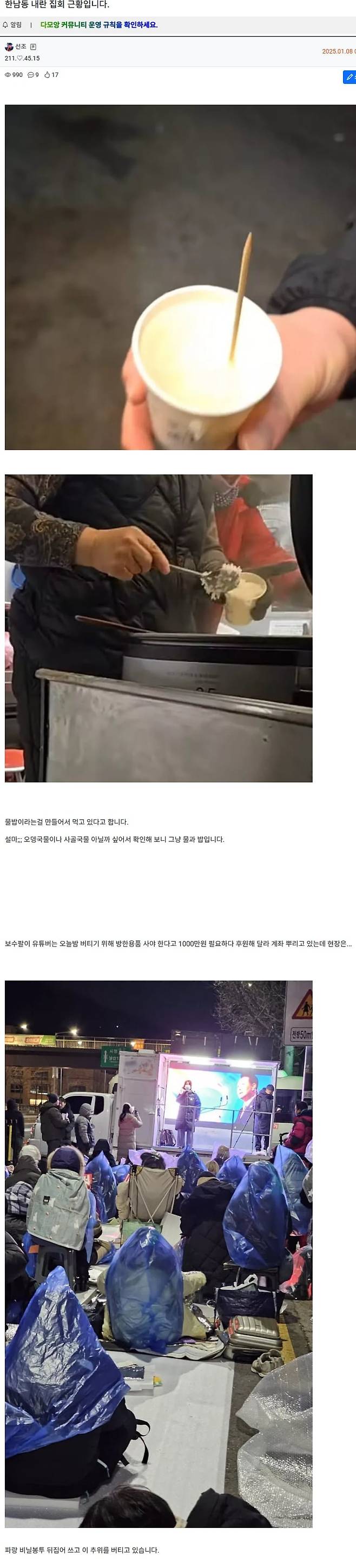 물밥이라는걸 만들어서 먹고 있다고 합니다.설마;;; 오뎅국물이나 사골국물 아닐까 싶어서 확인해 보니 그냥 물과 밥입니다.보수팔이 유튜버는 오늘밤 버티기 위해 방한용품 사야 한다고 1000만원 필요하다 후원해 달라 계좌 뿌리고 있는데 현장은...파랑 비닐봉투 뒤집어 쓰고…