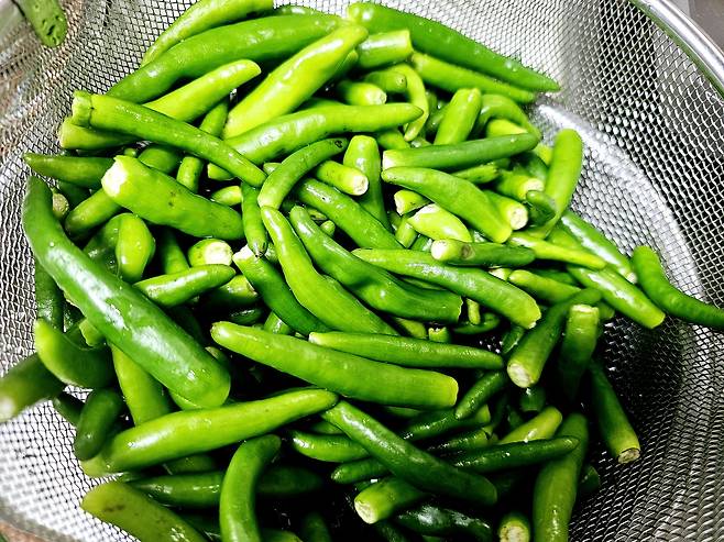 1.여리고추는 깨끗이 씻고 꼭지를 제거한 뒤, 크면 반으로 자릅니다.