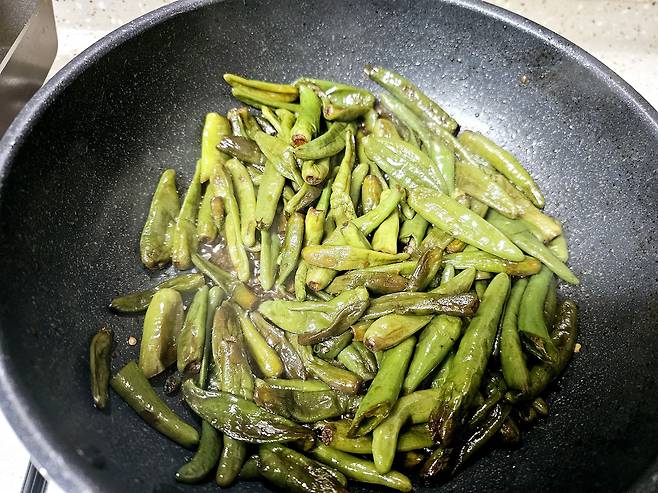 ▶ 여리고추의 풋내를 잡으려면 미림을 조금 넣어주는 것이 좋아요.