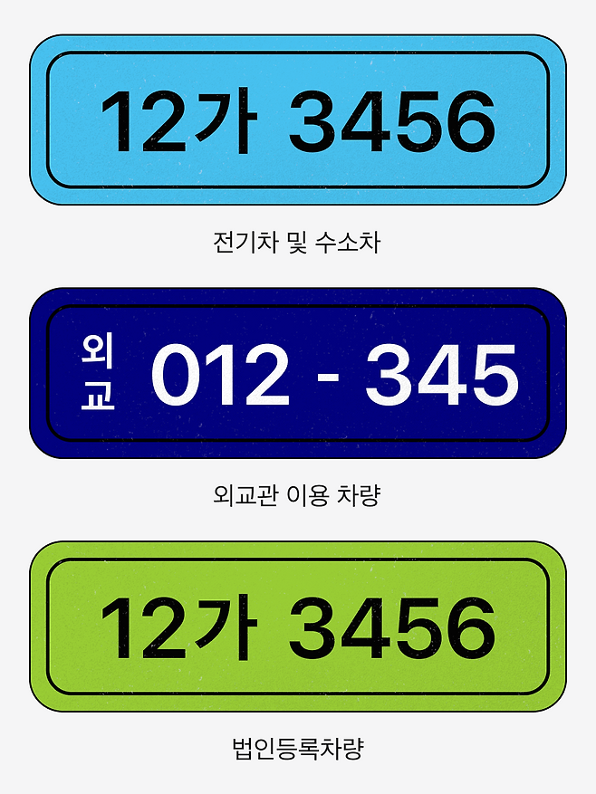 그 밖에도 버스, 택시와 같은 영업용 차량은 노란색을, 외교관 이용 차량은 진한 청색 배경을 사용하고 있어요. 그리고 최근에는 연두색 번호판이 새롭게 도입됐는데요. 이는 법인등록차량을 뜻하는 색상이에요.