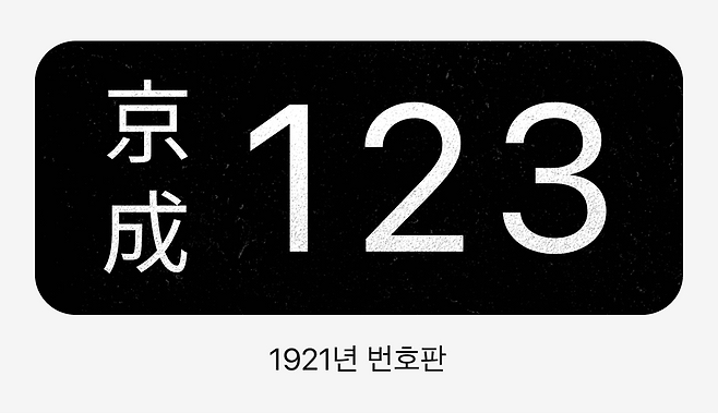 바로 1904년으로, 당시 오리이 자동차 상회라는 승합자동차 회사가 자동차 운송영업을 위해 전국 9개의 노선을 허가 받는 과정에서 국내에 처음으로 자동차 번호판을 달기 시작했다고 해요. 지금과 같이 직사각형 형태에 숫자와 지역을 표시하는 등 자동차 번호판의 규격이 정해진 시점은 그로부터 약 17년 뒤인 1921년의 일인데요. 당시에는 검은색 철판 좌측에 도시명이 한자로 위에서 아래로 내려 쓰고, 그 옆으로는 등록번호가 아라비아 숫자로 기재되는 형식이었다고 해요.