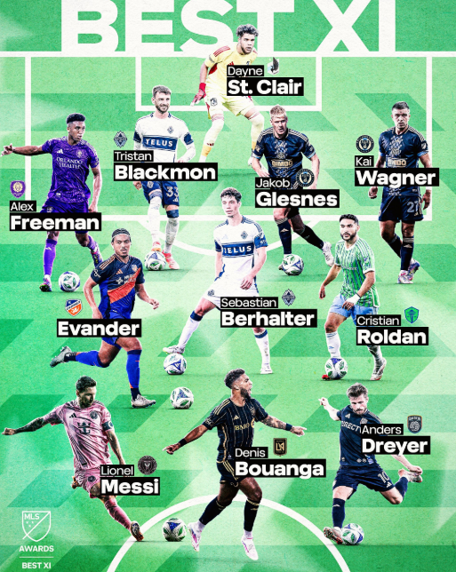 베스트11은 4-3-3 포메이션으로 구성됐다. 골키퍼는 데인 세인트클레어(미네소타), 수비진은 알렉스 프리먼(올랜도 시티), 트리스탄 블랙먼(밴쿠버), 야콥 글레스네스, 카이 바그너(이상 필라델피아)가 이름을 올렸다. 미드필더는 에반데르(신시내티), 세바스찬 버홀터(밴쿠버), 크리스천 롤단(시애틀)이 선정됐고, 공격진은 리오넬 메시(인터 마이애미), 드니 부앙가(LAFC), 안데르스 드레이어(밴쿠버)가 차지했다.