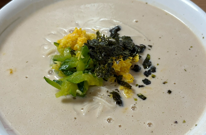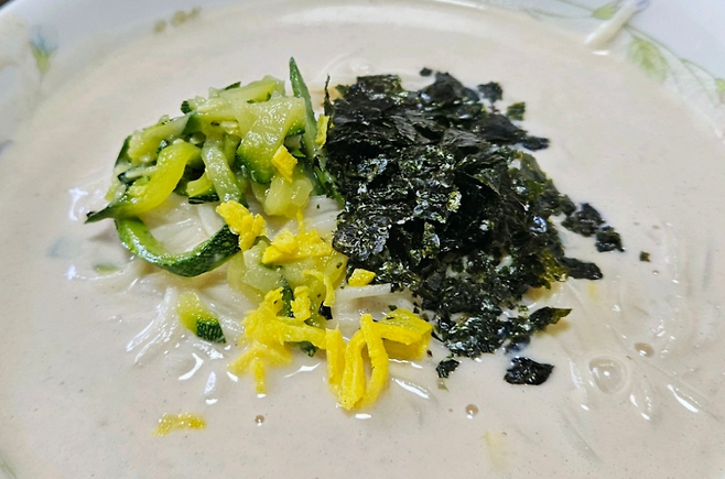 면발은 굵지 않고 슬쩍 부드러운 탄력감이 있는 가는 면이라 콩물과 어우러져 목 넘김이 부드럽다. 숟가락으로 콩물을 퍼먹다 보면, 어느새 그릇 바닥이 보일 만큼 담백하고 깔끔한 맛에 빠져든다. 그 위에 얹어진 고소한 고명은 짭짤함을 더해주며, 한 입 한 입이 여름 속 한 끼의 풍경을 완성시킨다.