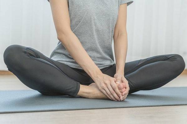매트에 앉아 무릎을 구부리고 양 발바닥을 맞댄 상태에서 발목 위에 손을 올립니다. 등을 곧게 펴고 허리를 세운 채, 무릎을 바닥 쪽으로 천천히 내리며 자극을 줍니다.