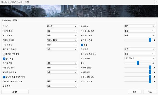 ‘라오어2 리마스터’의 그래픽 엔진은 너티독이 수년간 지속적으로 개선 발전시켜온 것의 최신판입니다. 여기에 PC의 가장 큰 장점, CPU와 GPU, RAM 등의 사양에 따라 퍼포먼스는 계속 상한선을 뚫을 수 있다는 것이죠. 이 두 가지가 합쳐졌고, 거기에 또 리마스터 PC 버전의 특전, 울트라 와이드 해상도까지 지원하는 혜택을 입었습니다. 아쉽게도 필자의 디스플레이는 기본 종횡비를 지원하는 것이어서 와이드 부분까지 온전한 경험을 하진 못했지만요.
