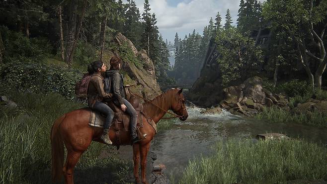 그렇더라도 극초반 조엘과 토미가 자신들의 새로운 정착지인 잭슨으로 이동하는 컷신에서부터 입이 벌어지는 체험을 할 수 있었습니다. 게임 속 아웃브레이크 발발 시점에서 25년이 흐른 2038년의 미국 곳곳 –모든 문명이 스러지고 대신 차지한 웅장한 자연 풍광- 이 현실적인 광원 효과와 시간 및 기후 변화에 따라 때로는 아름답게, 때로는 혹독하게 몰아칩니다.