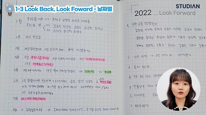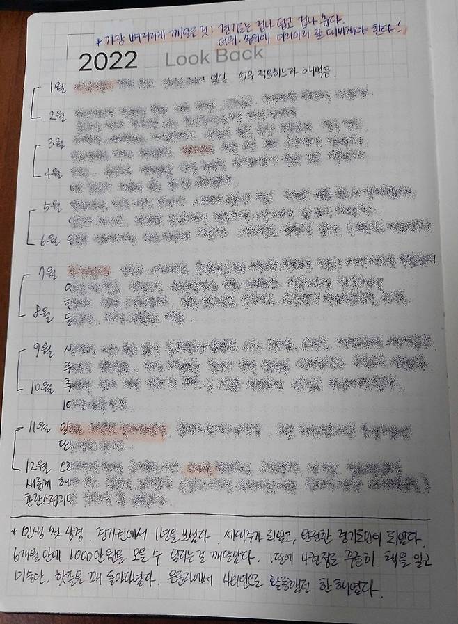 Look Back(룩백)은 작년 한 해 어떻게 보냈는지 돌아보며 기록하는 칸입니다. 저는 월별로 어떻게 한 달을 보냈는지 적습니다. 12달 모두를 돌아본 후 줄을 그어 평가를 내립니다. 좋았던 점, 아쉬웠던 점 모두를 기록합니다. 이렇게 하면 작년에 어떻게 살았는지 한눈에 볼 수 있습니다.