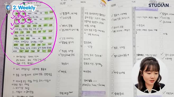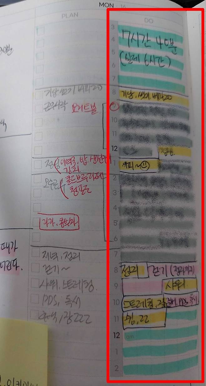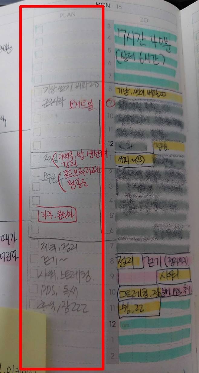 계획한 일 하나가 끝난 후 실제로 사용한 시간을 기록합니다. 각각 다른 형광펜 색깔로 기록합니다. 색깔이 칠해진 부분을 보면서 어떤 영역에 시간을 많이 쓰는지 한눈에 볼 수 있습니다. 집중이 잘 되는 시간, 집중이 안 되는 시간을 파악하기에 좋습니다. 게다가 실천한 일을 기록하면서 식단도 같이 기록하고 있습니다. 실내에서 일하는 직장인이다 보니 먹는 것을 조심하지 않으면 쉽게 체중이 증가하더군요. 체중 관리가 필요하다면 Do 칸에 무엇을 먹었는지 적는 것도 추천합니다.