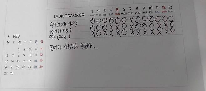 목표치만큼 완료되면 O, 그저 그랬다면 △, 지키지 못했다면 X 표시를 했습니다. Task Tracker 덕분에 아침 운동과 독서를 지금도 꾸준히 유지하고 있습니다.