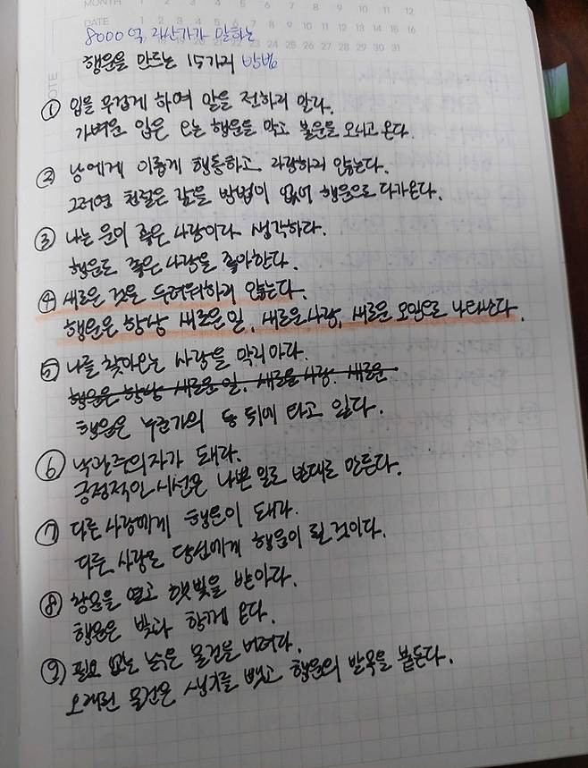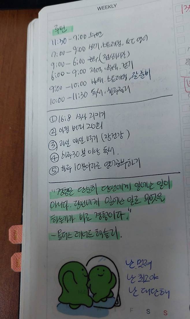 그리고 1주 동안 반드시 지켜야 할 루틴 3가지~5가지만 적습니다. 그다음 한 주를 보내기 전 생각을 정리하는 목적으로 빈칸에 좋은 글귀를 적습니다.