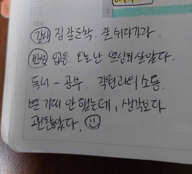 반성은 아쉬운 점을 찾는 시간입니다. 계획대로 시간을 보내지 못한 원인이 무엇인지 찾고, 계획한 일을 해내기 위해 개선해야 할 점이 무엇인지 찾습니다. 가끔 기분이 좋지 않을 땐 의식의 흐름대로 기록하기도 합니다.
