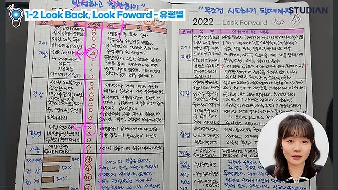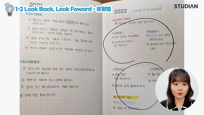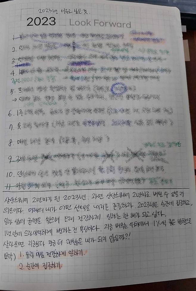 Look Forward(룩포워드)는 올 한 해 어떻게 보낼지 계획하는 칸입니다. 변수로 인해 계획이 얼마든지 변할 수 있기 때문에 여기는 룩백처럼 월 단위로 기록하지 않았습니다. 번호를 매기고 올해 이루고 싶은 목표 위주로 작성했습니다. 다 작성하고 줄을 그어 어떤 모습으로 변하고 싶은지 적었습니다.