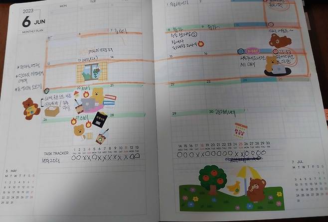 한 달 일정을 한눈에 보는 칸입니다. 왼쪽에 계획을 세우는 칸이 있고 아래에 Task Tracker 칸이 있습니다. T ask Tracker는 이번 달 만들고 싶은 습관 혹은 반드시 챙겨야 할 일을 점검하는 데 도움이 됩니다. 저는 아침 10분 운동, 저녁 30분 독서에 중점을 두고 기록했습니다.