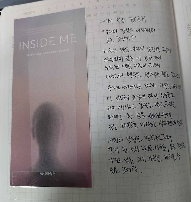개인적인 기록을 합니다. 책을 읽고 인상 깊었던 문장을 쓰거나 누구에게도 털기 힘든 고민을 적거나 취미생활 기록을 적습니다. 저는 전시회를 좋아하는데, 여기에 전시회 티켓을 붙여둡니다. 한 번씩 펼쳐볼 때 전시회 티켓이 밋밋했던 다이어리에 생기를 불어넣는 것 같아 기분이 좋습니다.