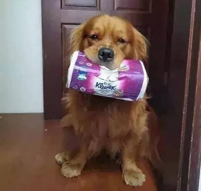 잠시후 정말 놀랍게도 강아지는 어떻게 화장지를 찾았는지 알 수 없으나 입에 화장지를 물고 집사에게 가져다주는 것 아니겠습니까.