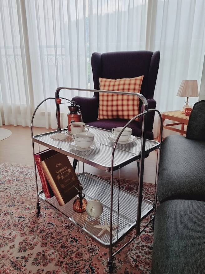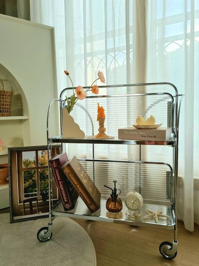 요즘 나오는 글라스 트롤리도 커피타임, 독서 타임에 잘 어울리는 거 같아요. 바퀴가 고정되니 위험하지 않게 사용할 수 있더라고요. 반으로 접었을 때와 다 펼쳤을 때 느낌이 달라서 여러모로 잘 사용하고 있어요.