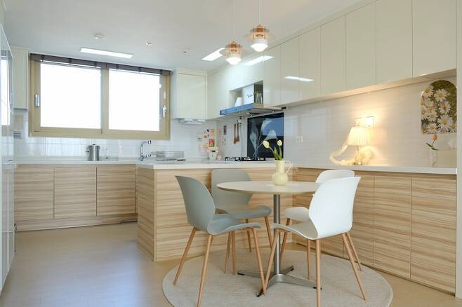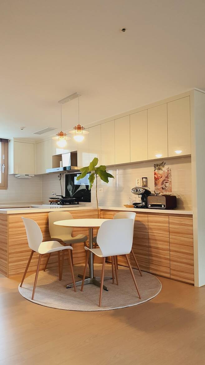 원래 6인용 원목 식탁을 사용했었는데 4인이 쓰기엔 멀기도 하고 아이들이 아직 작아서 좀 불편함이 있더라고요.