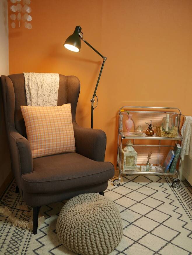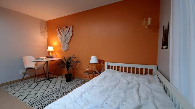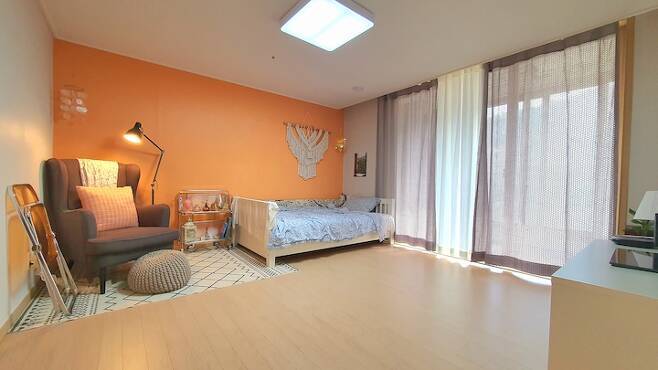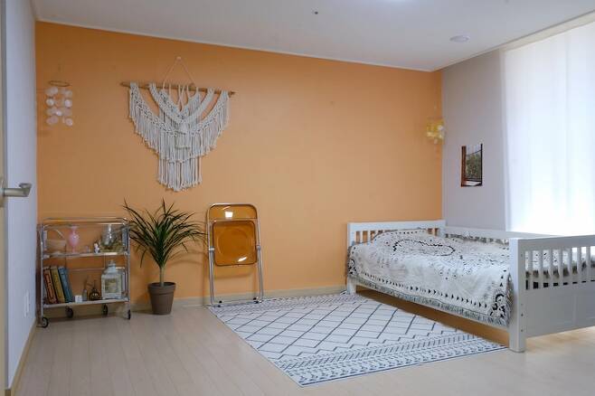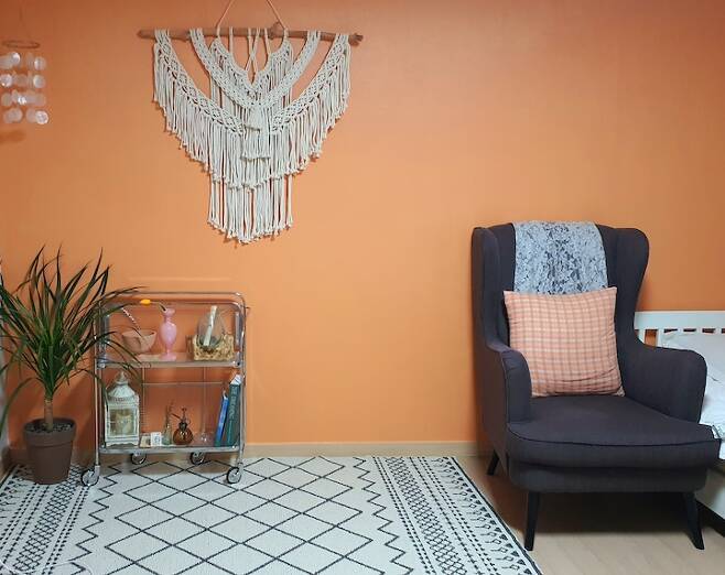 안방은 원래 칙칙한 회색빛의 벽지였는데 제가 좋아하는 오렌지빛의 페인트로 셀프 페인팅을 했어요. 일반 합지는 그냥 페인트만 바르면 되지만 실크 벽지는 혹시나 떨어질 수 있어서 젯소를 바르는 걸 추천하시더라고요. 젯소를 2회 정도 바르고 페인트도 2회 정도 발라서 하루 꼬박 말리면 원하는 색으로 만들 수 있답니다. 저는 친환경 페인트인 던 에드워드 매장에 가서 직접 색을 골라 조색해서 발랐어요. 칙칙하던 회색보다 밝아 보이고 제가 좋아하는 빈티지한 느낌도 나서 만족스럽답니다.