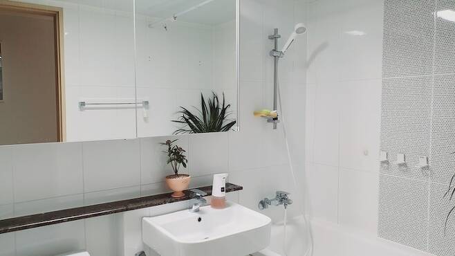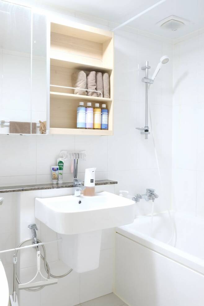공용욕실은 바닥에 보일러가 깔려 있어서 건식으로 사용하고 있어요. 샤워 후 찬물을 뿌려주면 습기 제거에 좋다고 해요. 샤워하고 습기 제거 후 스퀴즈로 한번 밀고 몸을 닦은 수건으로 바닥 한번 닦고 나면 욕실 정리 끝이에요. 매일매일 청소하지 않아도 습하지 않고 뽀송한 욕실을 만들 수 있답니다. 팔로산토를 피워 둬도 습기 제거에 좋고 향도 좋아서 추천드려요.