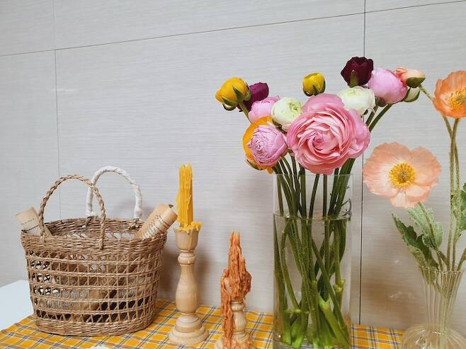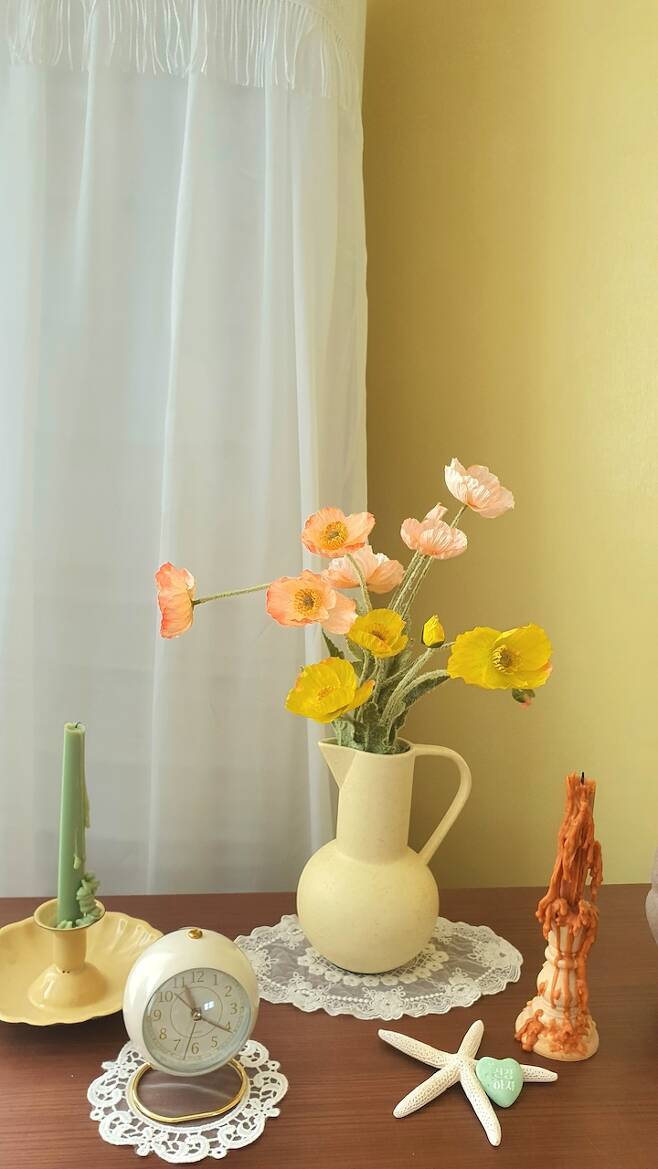 양귀비 조화를 이용해서 테이블을 꾸며보았어요. 생화도 좋지만 생화는 빨리 시드는게 아쉬워서 조화로 꾸며봤는데 색감도 마음에 들고 봄이 온 게 느껴져서 좋아요. 예쁜 꽃을 보면 기분도 좋아지고 저도 아름다운 기분이 들어서 행복해요.