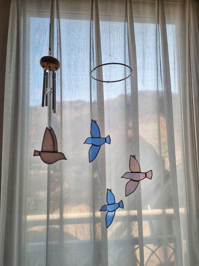 거제에 있는 유명 소품 잡화점 '깃들'의 시그니처 행운의 새 모빌이에요. 집안에 행운이 가득하라고 네마리나 매달려 있답니다. 보고 있으면 진짜 행운이 집으로 들어올 거 같아서 기분이 좋아져요.