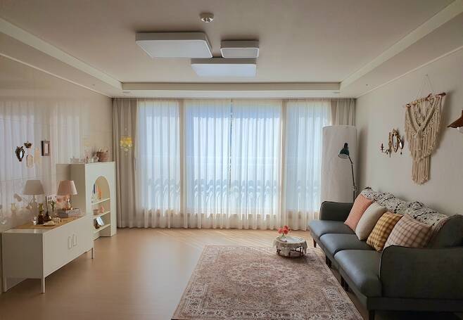 4베이에 남동향의 아파트고 바로 옆에 산이 있어서 모든 방과 거실에서 산을 볼 수 있답니다. 정남향의 집에 살아서 그런지 해의 중요성을 잘 몰랐는데 남동향을 살아보니 왜 정남향을 선호하는지 알 거 같아요. 아침에 일찍 눈이 떠지는 장점도 있지만 하루 종일 해가 드는 집이 가끔 그립기도 하답니다.