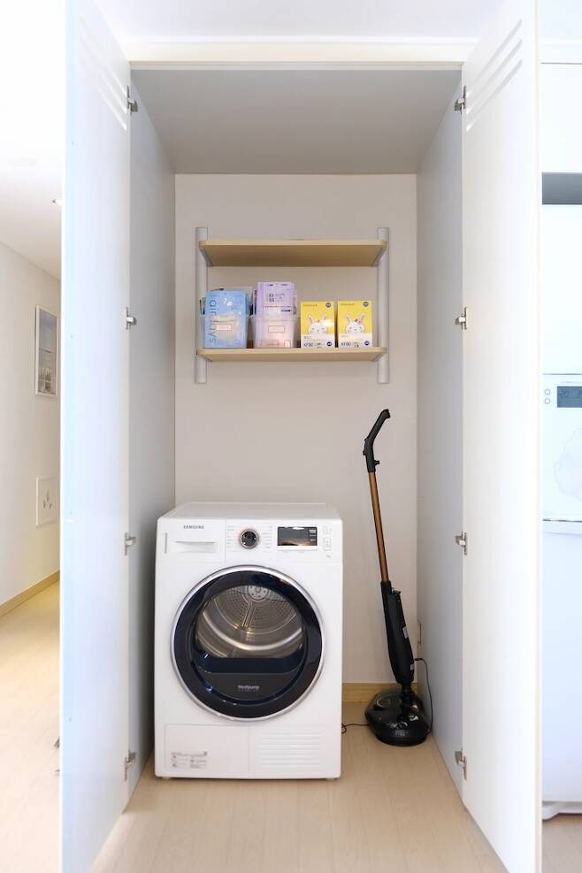 여기는 김치냉장고 자리인데 저희 집엔 김치냉장고가 없어서 건조기와 물걸레 청소기를 넣어뒀어요. 문 닫아두면 건조기 소음이 많이 들리지 않고 집의 한 가운데라 옷을 개어두면 각자의 방으로 가져가기가 딱 좋은 위치예요.
