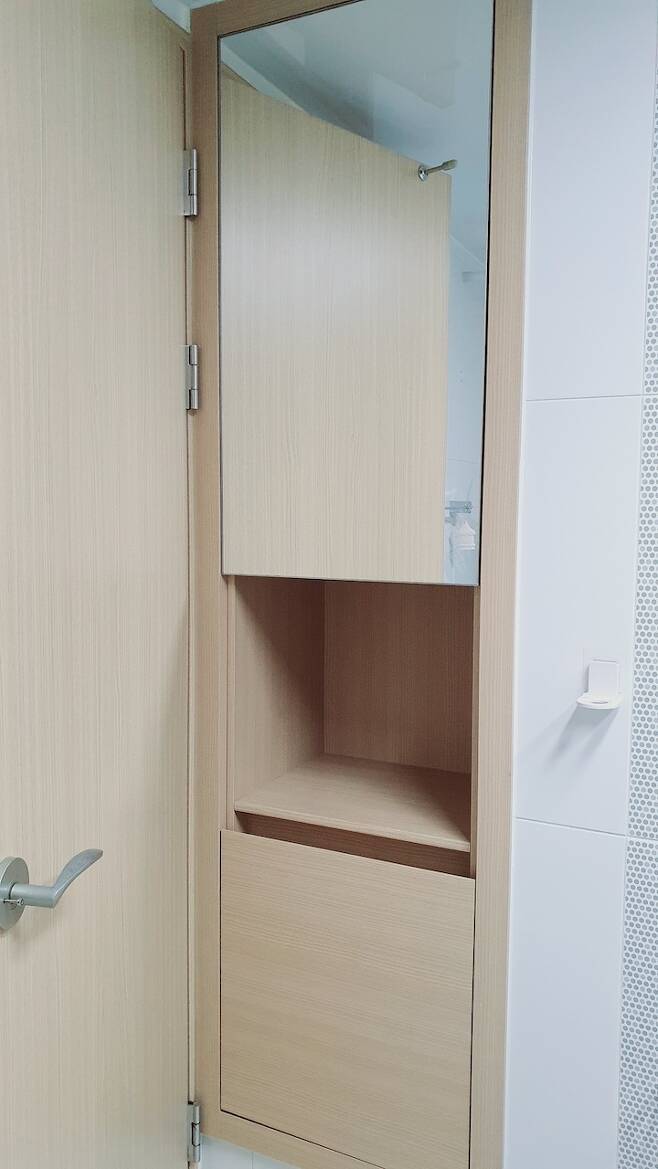 저희 집 욕실 문 뒤쪽에는 이렇게 장이 짜여져 있어요. 이 공간에는 욕실에 필요한 물품을 넣어 두고 사용 중이랍니다. 생필품은 떨어지지 않게 제때 구매해서 채워 두는 편이에요.