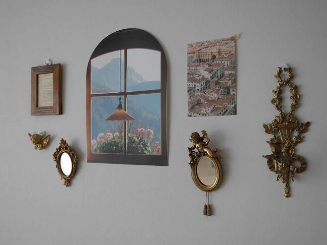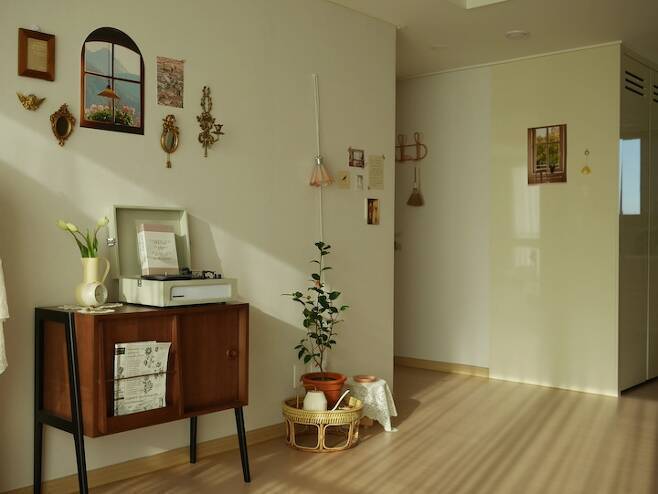 허전한 벽면에는 포인트가 되는 사진과 액자, 거울 등을 붙여 주었어요.