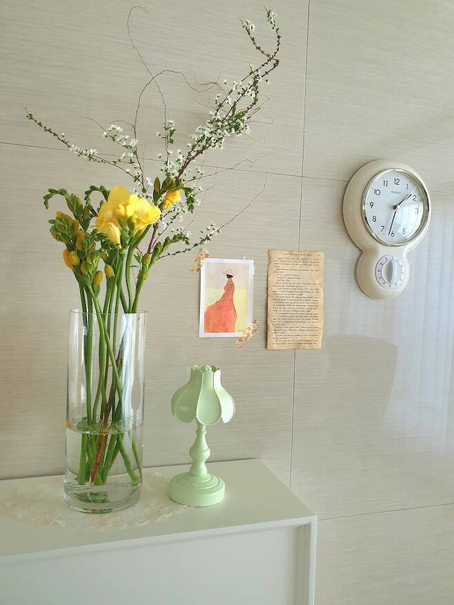 봄의 대표적인 꽃 '프리지아와 설유화'예요. 프리지아가 나오는 걸 보면 봄이 왔음을 알 수 있죠. 향기롭고 색상도 노랑 노랑해서 기분까지 힐링이 되는 예쁜 꽃이에요. 꽃을 오래 보려면 가지 밑부분을 사선으로 자르고 락스 1방울에 설탕을 조금을 넣고 얼음을 넣어두면 미생물 번식을 막아줘서 오래 볼 수 있다고 꽃 전문가님이 말씀하시는 걸 봤어요. 저도 그 방법을 쓰고 있는데 요즘 꽃들이 예전에 비하면 좀 빨리 시들해지는 거 같다는 생각이 들긴 해요. 이제 곧 꽃의 계절 봄이니 '예쁜 꽃들이 있는 집'을 만들어봐야겠어요.