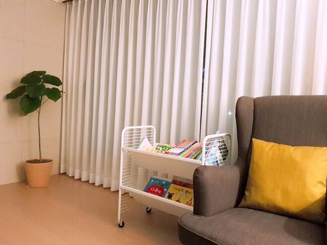 서재형 거실을 꿈꿀 때도 있었는데 지저분해 보일까 봐 시도는 못해보고 이렇게 북 트롤리를 둬서 아이들이 소파에 앉아 책을 읽도록 해주었어요. 바퀴가 달려있는 트롤리형 책 꽂이가 이동도 쉽고 장소 구애받지 않고 책을 읽기 편해서 추천해요.