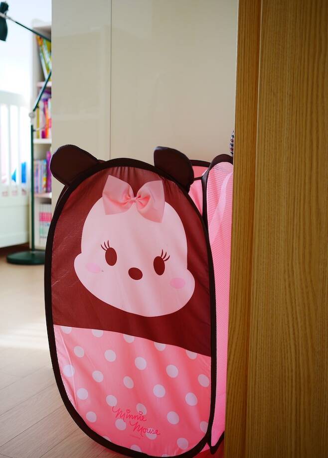 각자의 방에 각자의 빨래 바구니를 뒀어요. 다이소에서 3천 원에 산 건데 귀엽기도 하고 옆면이 매쉬망이라 잘 늘어나서 옷도 많이 들어가요. 코로나 시국이라 매일매일 옷을 갈아입다 보니 빨래 바구니가 유용하게 잘 쓰이고 있어요.
